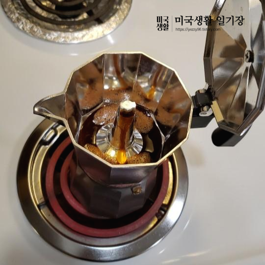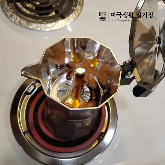 위에 주전자를 잘 끼운 다음, 스토브 위에 불을 올려주면 잠시 뒤 중앙 부분에서 에스프레소가 추출되어 올라와요!!