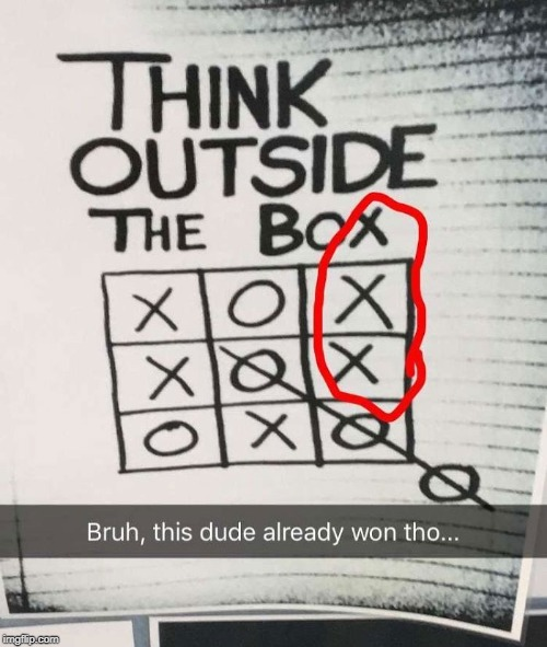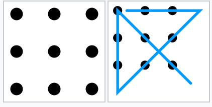 Box를 ‘틀’이라 생각하면 ‘고정된 틀' 밖에서 생각해라 라는 뜻으로 해석됩니다. 여기서 사실 재미있는 어원이 있는데요. 1950년대 부터 유행했던 ‘nine dots puzzle’에서 유래되었습니다. 펜을 떼지 않고 9개의 점을 모두 이어야 하는 퍼즐로 어렸을 때 수학책에서 한 번씩 보신 적이 있으실 거예요. 여기서 9개의 점을 전부 이으려면 네모난 상자 (Box)를 넘어야 이 퍼즐을 풀 수 있는 있는데 여기서 유래된 어원입니다