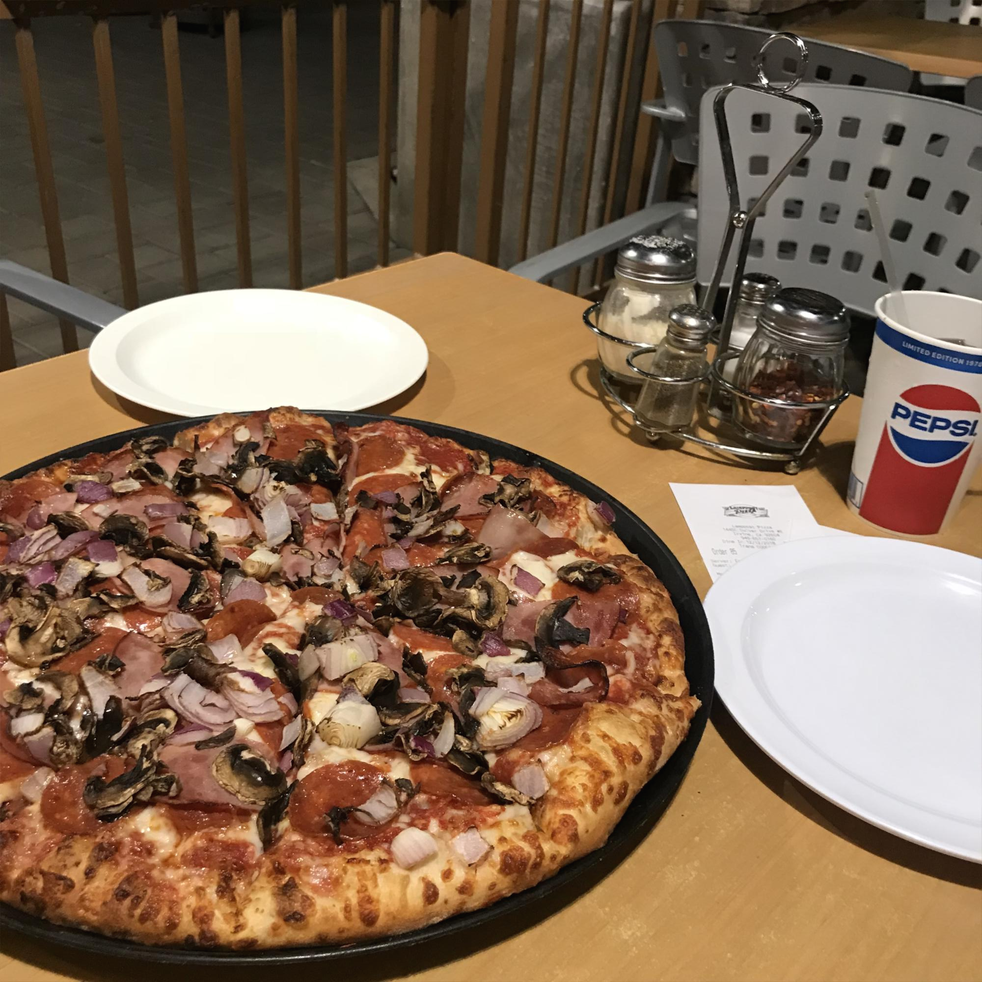 저희는 Creat My Own Lamppost Pizza / Medium Size + 토핑 3(페퍼로니, 캐네디언 베이컨, 버섯) 이렇게 시켰어요.